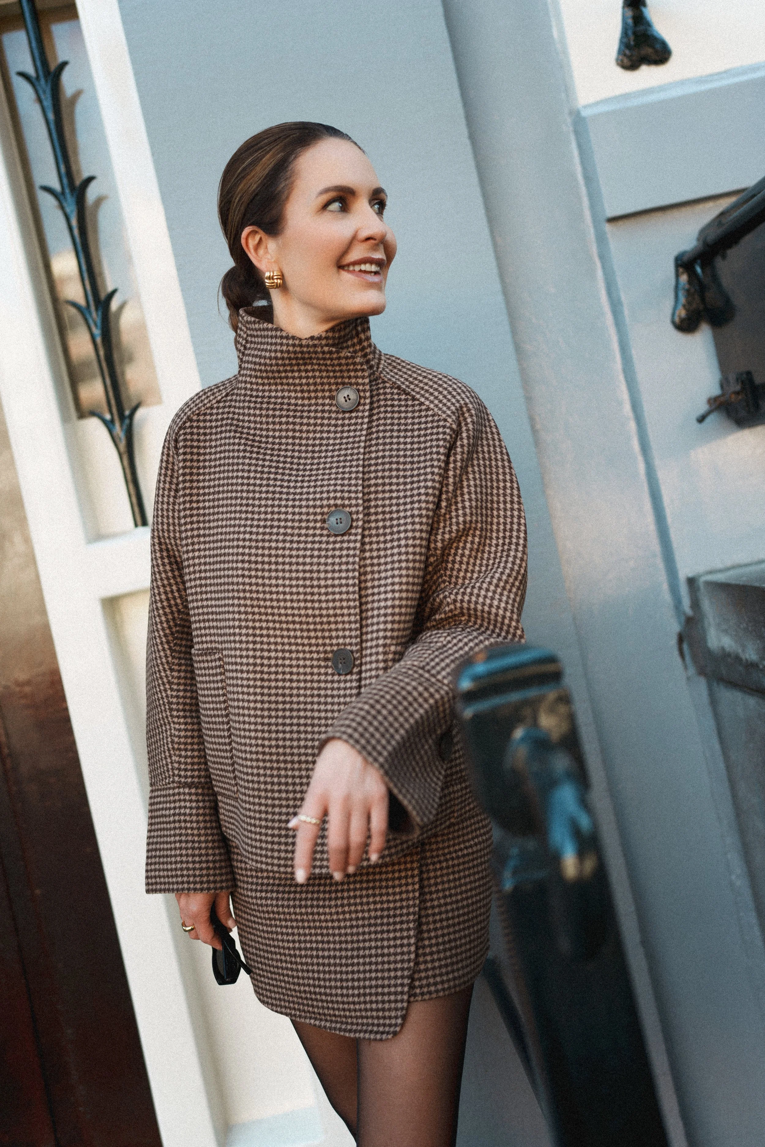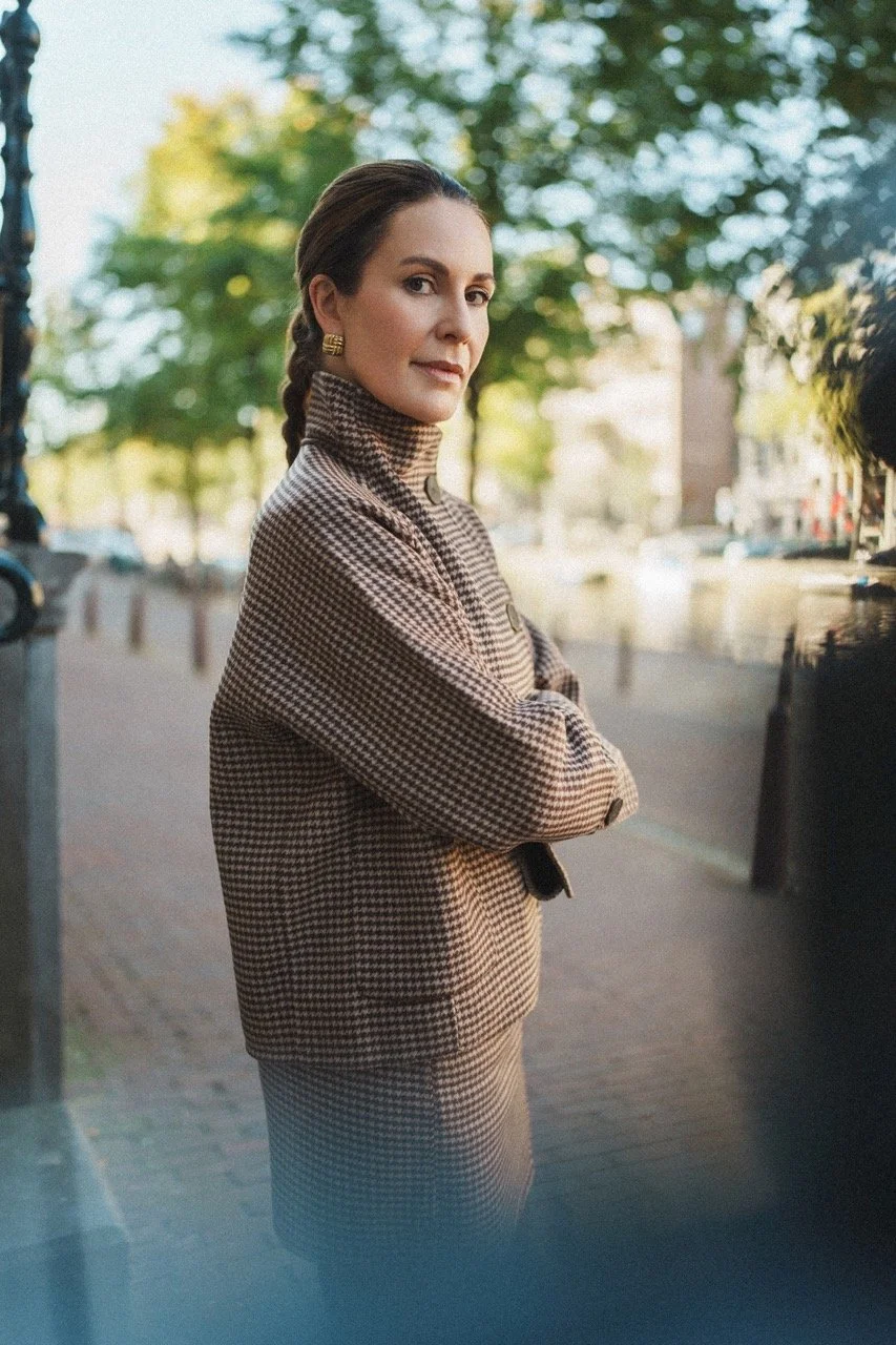 A woman with braided hair, wearing earrings and a houndstooth patterned blazer over a matching skirt, standing outdoors on a city sidewalk with trees in the background.